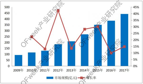 2009-2017年中國(guó)激光設(shè)備行業(yè)市場(chǎng)規(guī)模及增長(zhǎng)率
